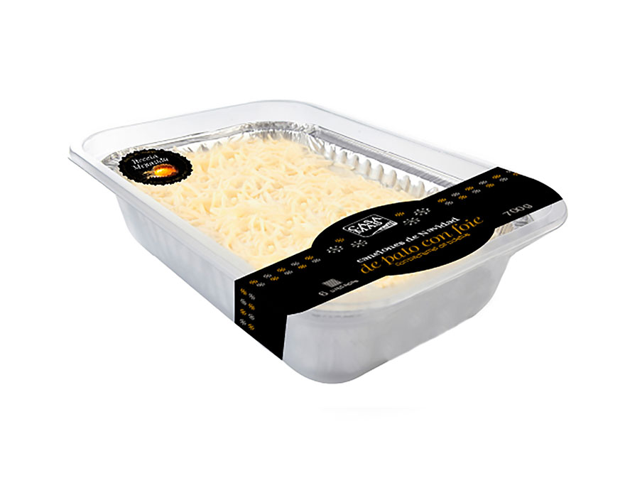 Horno: Con el horno caliente (200ºC), retirar el envase de plástico e introducir la bandeja de aluminio en el horno a una altura intermedia. Hornear durante 25 minutos y gratinar al gusto.