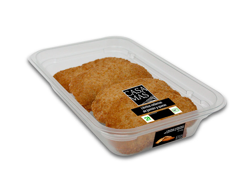 Preparado para rebozar (harina de trigo, agua, gluten, sal, aceite de oliva, azúcar, levadura, gasificantes: difosfato disódico y bicarbonato sódico; estabilizantes: goma xantana y monoglicéridos y diglicéridos de ácidos grasos y colorantes: caramelo de sulfito amónico y beta-apo-8’-carotenal), lomo de cerdo 41%, fiambre magro de cerdo (carne de cerdo, agua, fécula de patata, sal, azúcar, gelificantes: carragenanos, goma xantana, goma garrofín y goma tara, fibra alimentaria, jarabe de glucosa y estabilizantes: trifosfatos, polifosfatos y difosfatos, plasma, conservadores: acetatos de sodio y nitrito sódico, especies, aromas, dextrosa, antioxidantes: eritorbato sódico y citratos de sodio; colorante: carmín) y queso edam.