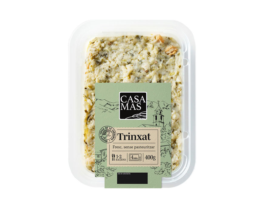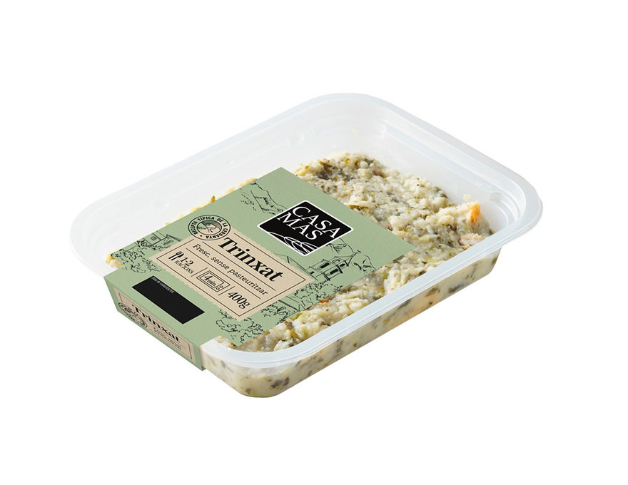 Receta típica de la Cerdanya, con patata, col verde y trozos de panceta. Mantenemos la esencia del trinxat tradicional, ahora con más sabor. Ideal para 1-2 raciones.